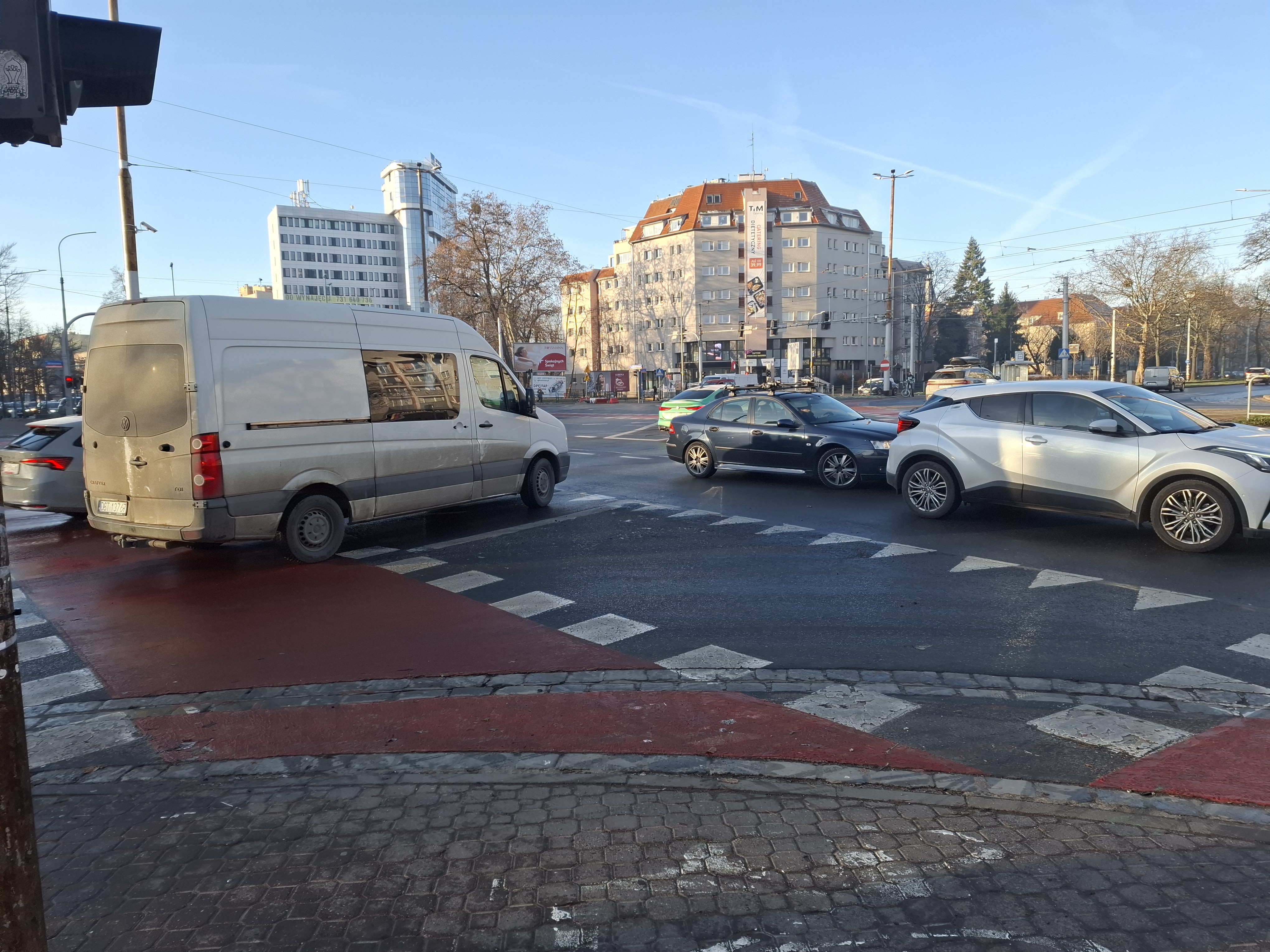 Zwężenie na ulicy Powstańców Śląskich jest dość niebezpieczne dla kierujących autami. Powoduje że samochody nie mogą wyjechać ze skrzyżowania mimo że na nie wjechały.